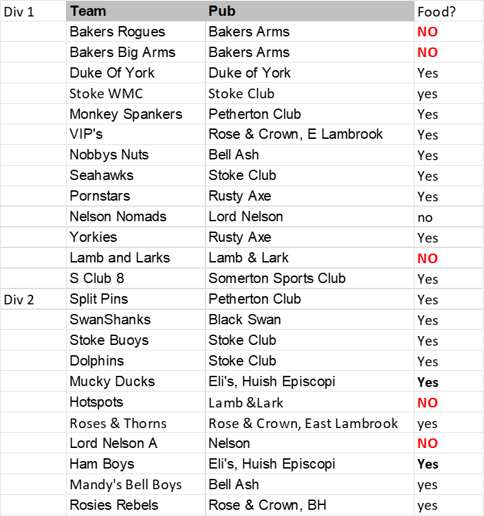 Hot on the heels of Duke of York are the reigning champs Stoke WMC who generally seem to start cold in the 1st half of a season, but they have started superbly and sit a point behind Duke in 2nd. This week they were away to Rusty Axe who have struggled since the opening week win and are in a familiar spot to last season near the relegation trap door. A potential ‘Match of the Round’ was at the Bell Ash as Nobbys Nuts lost their unbeaten record last time out to Bakers Rogues so wanted to get back to winning ways, but they faced the resurgence of former champs Monkey Spankers who are determined to make amends for the disappointment of last season and have started well in 3rd spot. There was a quality match of 2 strong teams at Stoke Club on the bottom alley. Hosts Seahawks have had a up and down start and are in mid table, they are generally strong at home which they needed to be as they faced Bakers Rogues who have started well and find themselves in 4th looking to get a statement win here. The fun loving Bakers Big Arms have started very well and find themselves in the mix for the top spot but need big wins to give themselves that opportunity and they had a good chance here as they hosted bottom team S Club 8 needing that 1st win of the season soon to not get cast adrift of the pack.