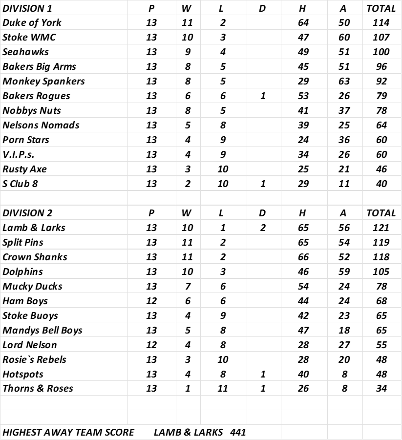 The tables are based on information supplied by home captains. Results supplied late may not be included. Please ensure you supply results within 48 hours of the game. Results supplied should include any individual high score for the AWAY team.