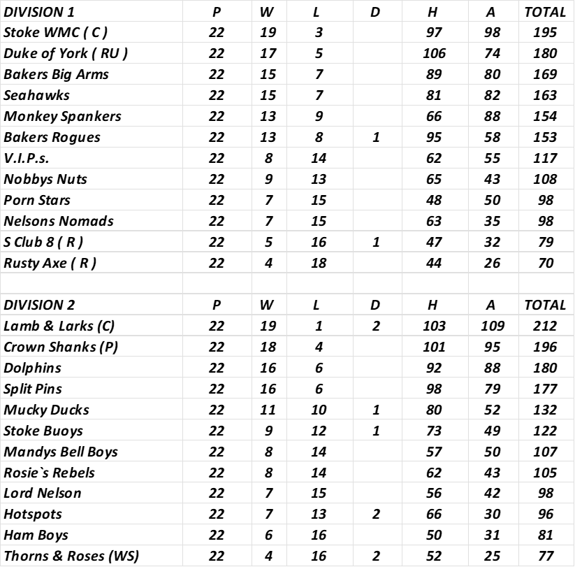 The tables are based on information supplied by home captains. Results supplied late may not be included. Please ensure you supply results within 48 hours of the game. Results supplied should include any individual high score for the AWAY team.